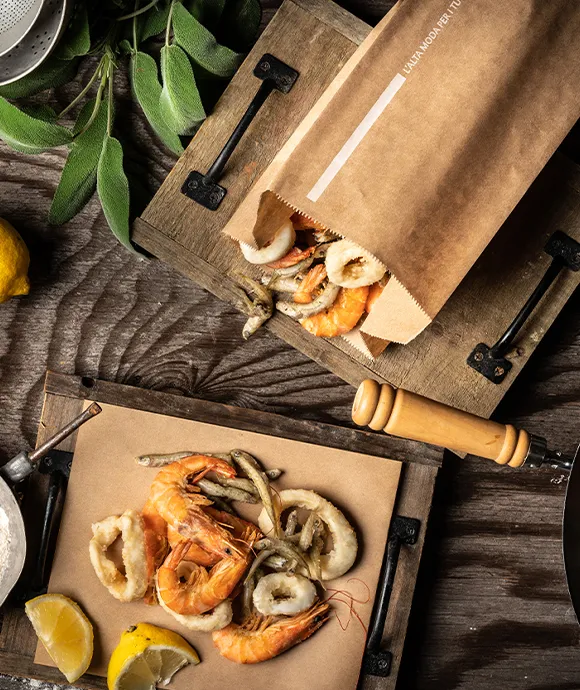 Nel caso di alimenti fritti come le verdure, il pesce, o i tradizionali arancini, è possibile versare l’alimento dal cestello delle friggitrice sulla carta Olà, per scolare il primo olio, per poi realizzare un impiattamento originale con la carta utilizzata come base per taglieri, come sopra piatto o per fare il tradizionale “cuoppo”.
