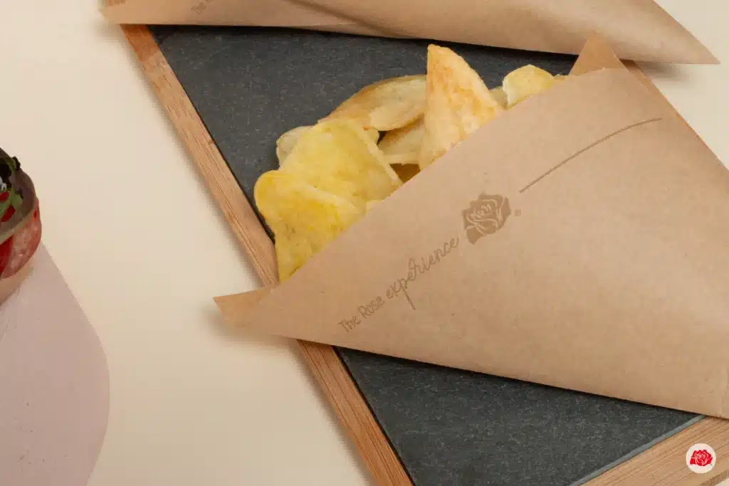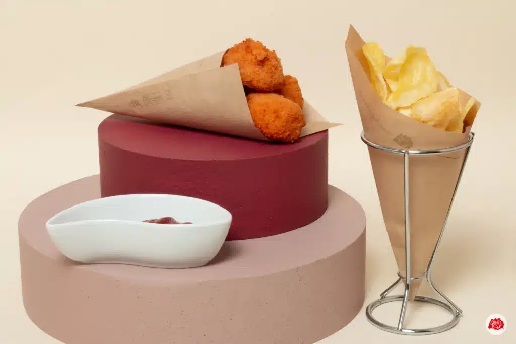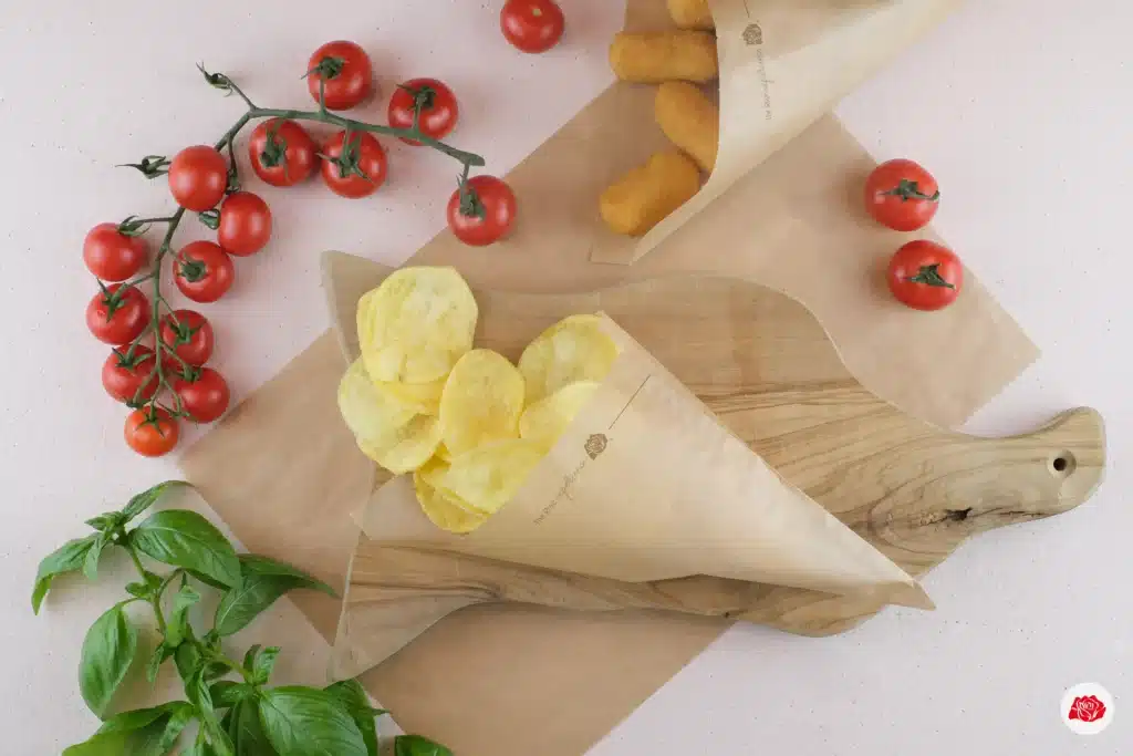 Il Cono Olà è un prodotto in carta antigrasso, che rappresenta una soluzione pratica ed efficace per cibi fritti e ricchi di condimento, sia per lo street food sia per servire i finger food durante eventi e catering in generale. I Coni della Rosa sono idonei al contatto diretto con tutti gli alimenti, resistono all’unto, non si macchiano e, altra fondamentale caratteristica per un packaging di qualità, l’elevata grammatura della carta protegge le mani dal calore.